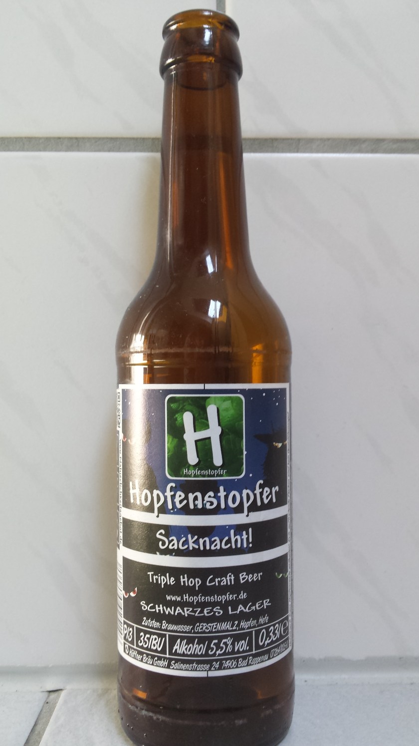Es ist Winter und die Tage werden immer kürzer. Demzufolge ist es inzwischen bereits zwischen 4 und 5 dunkel. Daher passt unser heutiges Bier mit dem Namen Sacknacht, wohl perfekt zur aktuellen Jahreszeit. Hergestellt wird es bei der Häffner Bräu in Bad Rappenau. Hier in der schönen Kurstadt bei Heilbronn braut der Braumeister der Häffner Bräu, Thomas Wachno, unter dem Label Hopfenstopfer, zusätzlich zum normalen Sortiment der Häffner Bräu, abwechselnd die verschiedensten Craft Beer Spezialitäten. Unser heutiges Testbier ist ein schwarzes Lager. und daher eher einem der klassischen heimischen Bierstile zuzuordnen. Im Unterschied zu normalen Schwarzbieren, ist es aber dreifach gehopft. Ich bin gespannt auf den Geschmack. Es hat einen Alkoholgehalt von 5,5%.