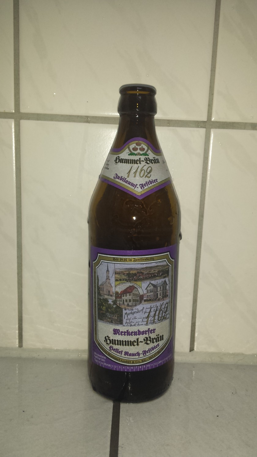 Für meinen heutigen Test geht es mit dem 1162 Jubiläums Festbier zur Brauerei Hummel ins fränkische Merkendorf bei Bamberg. Das Bier wurde ursprünglich 2012 zur 850 Jahr Feier des Ortes eingebraut ist jedoch seither fester Bestandteil im Sortiment des Betriebes. Das Bier ist ein stärker eingebrautes Rauchbier mit einem Alkoholgehalt von 5,6%.