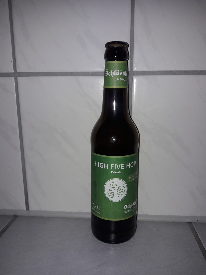Im heutigen Test gibt es dieses Mal ein Bier der Brauerei Schlössle aus Neu Ulm. Das High Five Hop ist ein Pale Ale mit einem Alkoholgehalt von 6,4%. Wie man dem Namen entnahmen kann wurde das Pale Ale ganze 5 verschieden Hopfensorten verwendet.