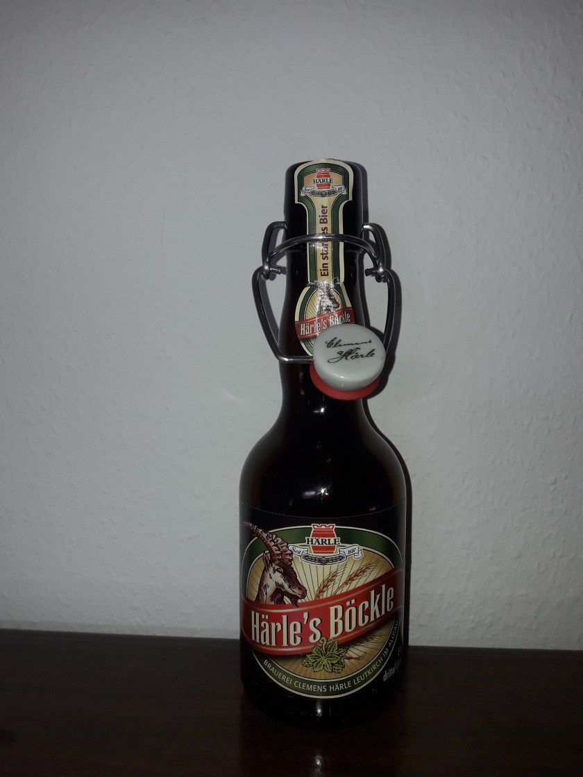 Härle’s Böckle, das starke im Sortiment der Traditionsbrauerei aus dem Allgäu soll nun Thema des folgenden Biertests sein. Stilecht im laut Website handwerklich gefertigten Holztkasten kommt dieses Bier in der kleinen Bügelfasche daher und ergießt sich nun in mein Glas. Der Alkoholgehalt liegt bei 6,9%.