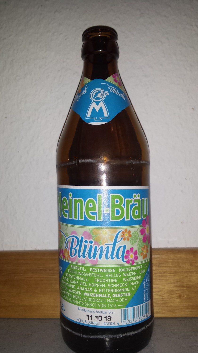 Der Frühling ist in vollem Gange und überall beginnt es zu blühen und die Knospen sprießen. Da ist es doch nicht weit hergeholt, dass ich heute ein Bier verkoste das auf den Namen Blümla hört. Gebraut wird es von der Brauerei Meinel aus dem fränkische Hof. Als Saisonbier ist gerade jetzt verfügbar, nämlich in der Zeit zwischen Ostern und Hochsommer. Stilistisch handelt es sich um Weizenbier, von der Brauerei wird es auch als Frühlingsweizen betitelt. Der Alkoholgehalt liegt bei 5,5%.