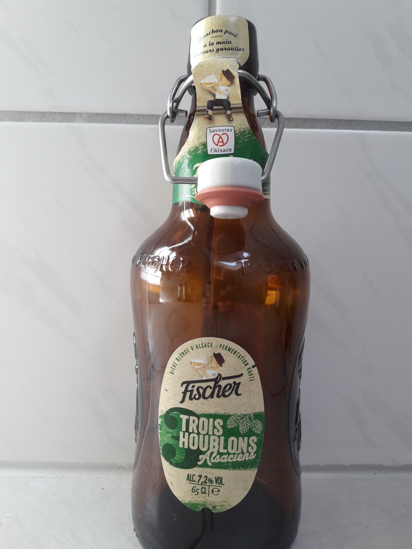 Ins Elsass führt mich heute mein nächster Biertest. Es gibt ein Bier der Brasserie Fischer, wobei es sich hier genauer gesagt nur noch um eine Marke handelt, denn die Brauerei Fischer ist schon seit 2009 keine aktive Brauerei ehr. Stattdessen ist Fischer inzwischen eine der vielen Marken im Heineken Portfolio, die Fischer bereits im Jahre 1996 übernommen hatten. Ihren Sitz hatte die Brauerei in Schiltigheim im Großraum Straßbourg. Ebenfalls in Schiltigheim betreibt Heineken aber auch eine eigene Brauerei, die ehemalige Brasserie de l’Esperance, in welcher die Biere nun gebraut werden. Weltweit bekannt sind die Fischerbiere, vor allem durch ihre kuriosen Flaschen. Diese kunstvoll verzierten Bügelflaschen stechen einem beim Bierkauf sofort ins Auge. Das Trois Houblons, das ich heute verkosten werde ist laut angaben ein Starkbier, bei dem zum brauen 3 verschiedene Hopfensorten verwendet wurden. Der Alkoholgehalt liegt auch bei 7,2%.