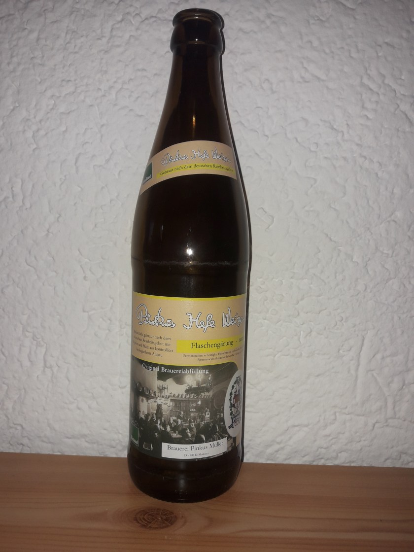 Für den nächsten Biertest gehe ich ins westfälische Münster. Von ehemals über 150 Brauereien in der Domstadt hat sich heute als einzige alteingesessene nur die Brauerei Pinkus Müller erhalten. Diese ist seit ihrer Gründung im Jahre 1866 im Besitz der Familie Müller und braut noch immer an ihrem historischen Standort in der Altstadt Münsters. Neben dem klassischen Altbier hat die Brauerei ihr Sortiment in den letzten Jahren stetig erweitert und verwendet hierbei nur Zutaten aus biologischem Anbau. Ich werde heute das Weizen verkosten. Der Alkoholgehalt liegt bei 5%.