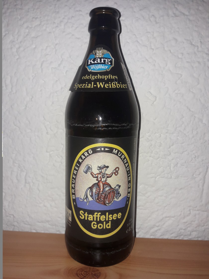 Bei der oberbayerische Brauerei Karg aus Murnau sind sie wahre Spezialisten, wenn es um das Brauen von bayerischen Weißbieren geht. Jedoch haben findet sich neben den klassischen Weizenbieren auch die ein oder andere Spezialität im Sortiment. So zum Beispiel mein heutiges Testbier, das Staffelsee Gold. Dieses kräftige Weizen, besticht laut Website vor allem durch seine für ein Weissbier starke Hopfengabe mit feinstem Aromahopfen. Ob dies dem Bier wie beschrieben eine besondere Hopfenblume verleiht, möchte ich mit dem folgenden Test nun herausfinden. Der Alkoholgehalt liegt bei 5,8%.
