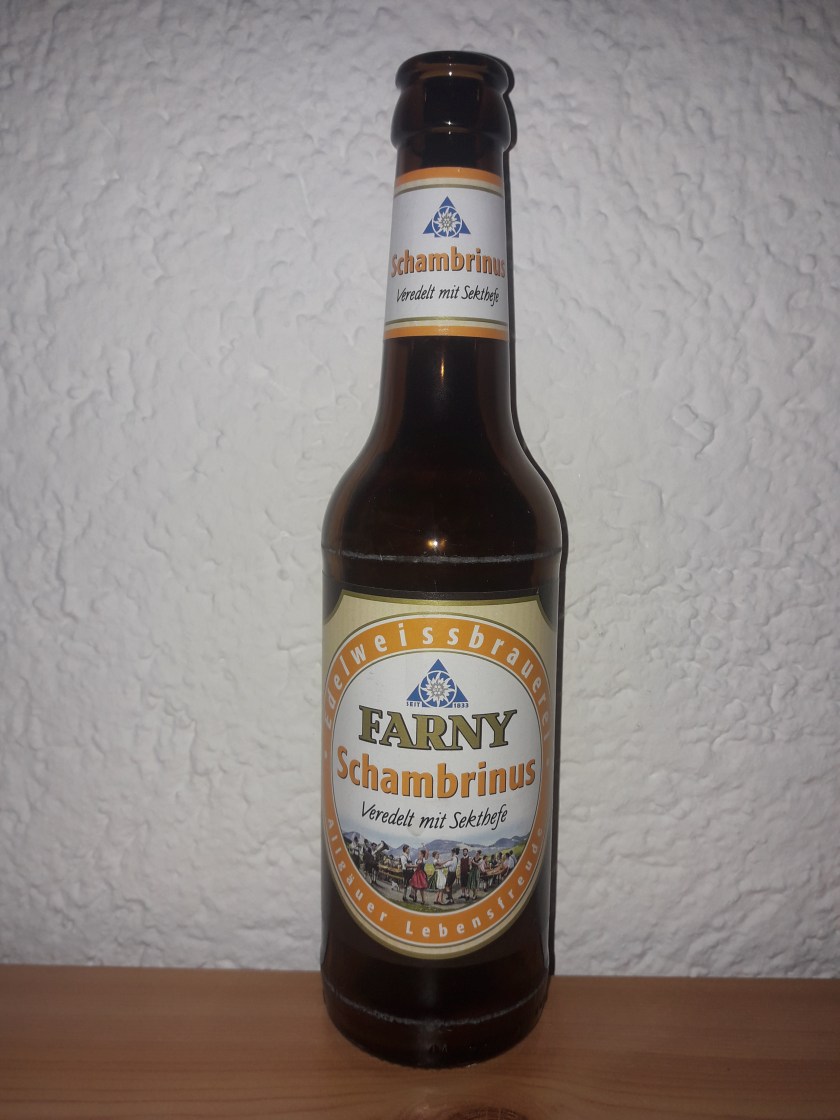 Der Schambrinus der Brauerei Farny aus dem Allgäu ist ein ganz spezielles Weißbier. Dies liegt daran, das zur Endvergärung hier eine besondere Sekthefe aus Frankreich verwendet wird, die vom offiziellen Weinbauinstitut der Champagne stammt. Das Bier ist somit als eine Alternative für Bierfreunde bei einem Sektempfang oder ähnlichen Anlässen, die einen Aperitif erfordern, gedacht. Der Alkoholgehalt liegt bei 5,3%.