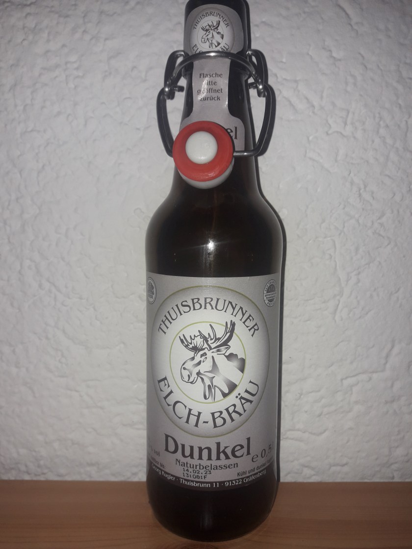 Das es sich auch in der heutigen Zeit noch lohnen kann eine Brauerei zu eröffnen, die langfristig bestehen bliebt, zeigt mein folgender Testbeitrag. 2002 übernahm die Familie Kügler den Gasthof Seitz in Thuisbrunn und kann damit im nächsten Jahr nun bereits 25 Jähriges Jubiläum feiern. Seit 2007 braut man zudem unter dem Namen Elchbräu eigene Biere. Aber auch Schnäpse aller Art werden von der Familie gebrannt und runden zusammen mit dem Gasthof das Angebot ab. Angeblich wurde auf dem Gelände des Gasthofes schon seit dem 16. Jahrhundert Bier gebraut, jedoch belebte erst Familie Kügler nach Jahrzehnten diese Tradition wieder. Heut sind die Biere auch weitläufig außerhalb des Gasthofes, der sich in der fränkischen Schweiz befindet, erhältlich. Zudem ist der Gasthof Endpunkt des sogenannten Fünf Seidla Steigs, einem Bierwanderweg rund um die Stadt Gräfenberg, der an insgesamt 5 Brauereien vorbeiführt. Klassisch fränkisch verkoste ich im heutigen Test ein Dunkles Bier. Der Alkoholgehalt liegt bei 4,9%.