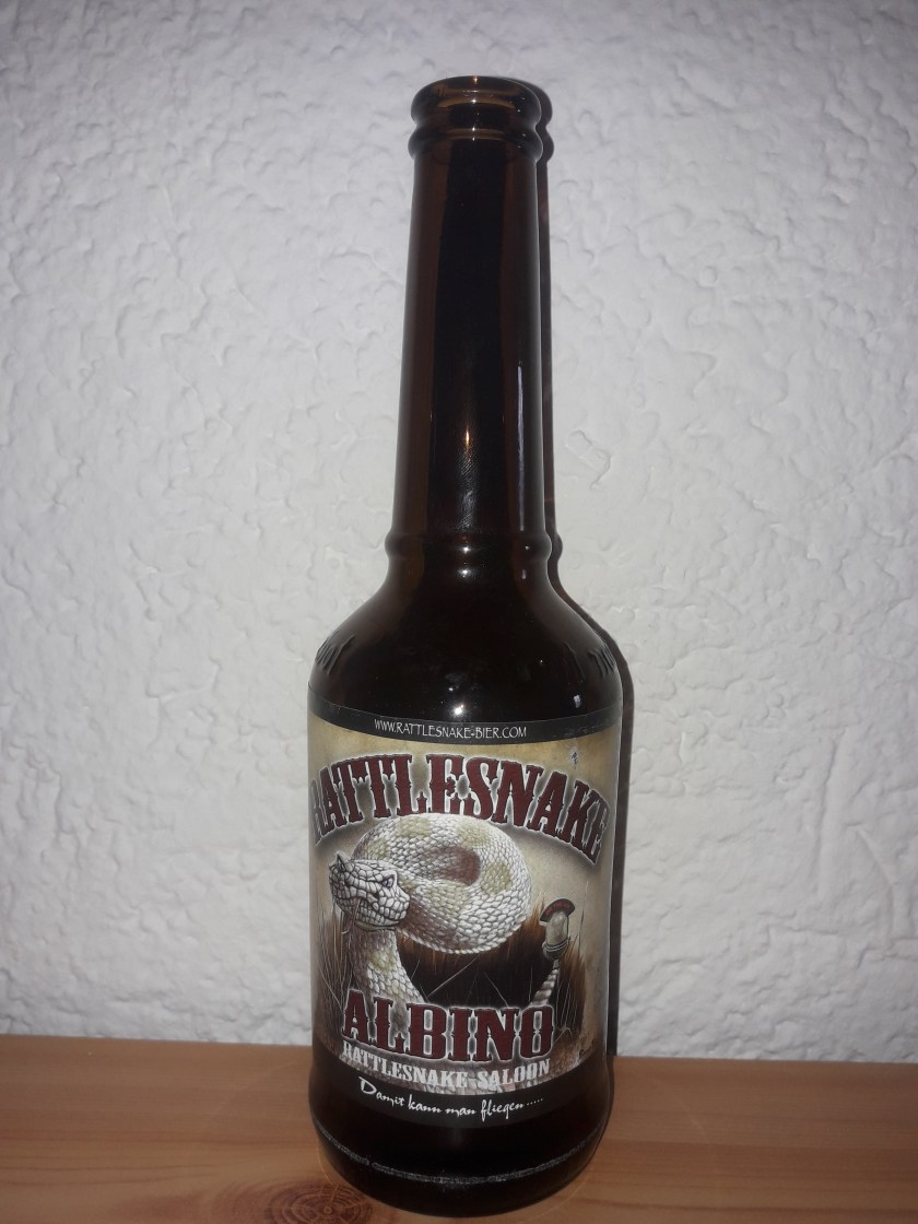 Der Rattlesnake Saloon in München ist genau das, was man sich unter einem Saloon im wilden Westen so verstellt. Man trifft dort zwar nicht zwansgläufig auf Cowboys, dafür aber auf Countrymusik und Barbecue. Und wie es sich für einen ordentlichen Saloon gehört, hat das Rattlesnake auch sein eigenes Bier, welches exklusiv von der Thorbräu aus Augsburg gebraut wird. Von den Rattlesnake Bieren verkoste ich heute den Albino, der ein Mix zwischen Eigenschaften von Pils und Hellem sein soll. Der Alkoholgehalt liegt bei 5%.