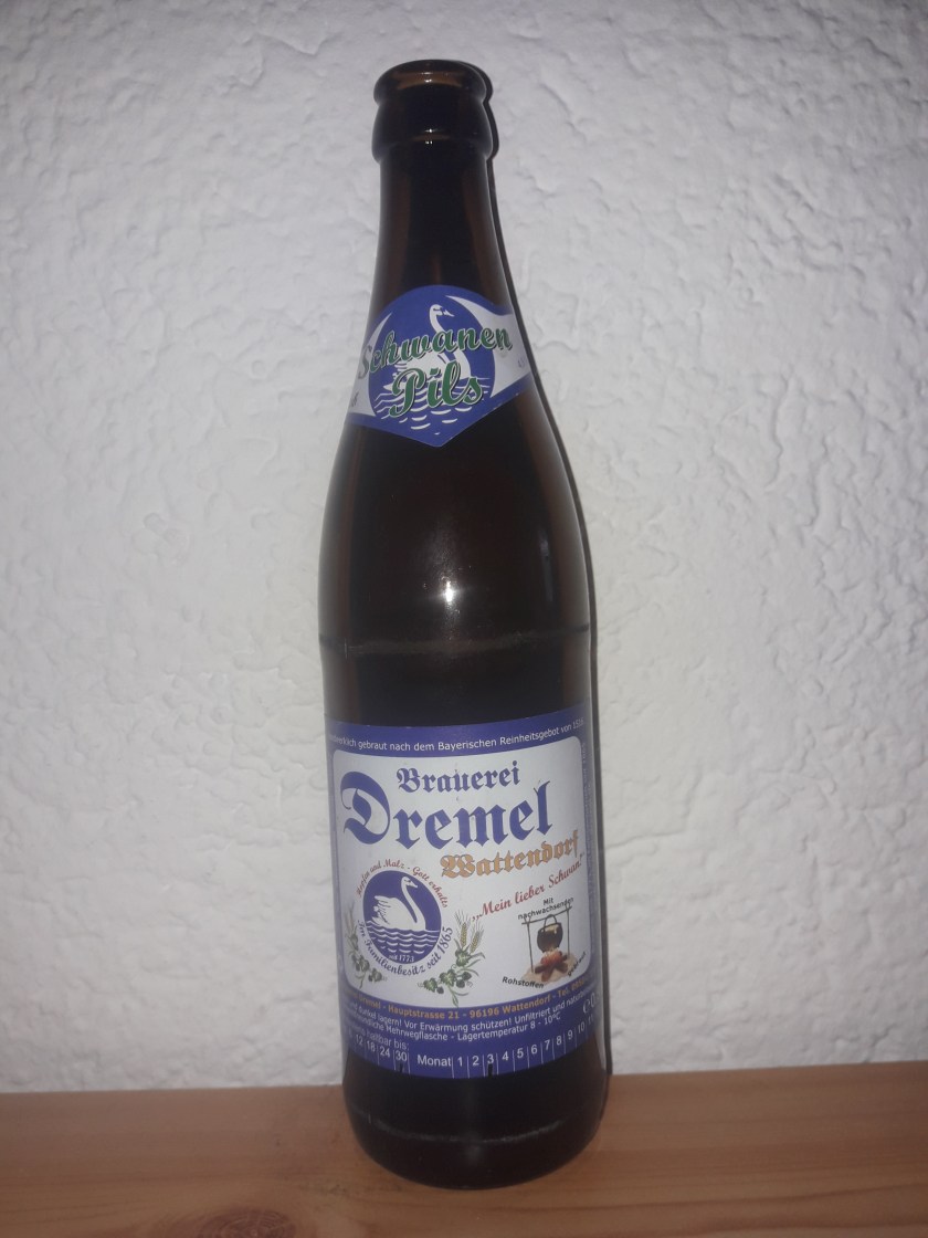 In Wattendorf, der kleinsten Gemeinde im Landkreis Bamberg scheint die Welt noch in Ordnung zu sein, zumindest wenn man Liebhaber fränkischer Biere ist. Ganze 2 Brauereien befinden sich in der gerade einmal 632 Einwohner zählenden Gemeinde. Neben der Brauerei Hübner, deren Biere es leider nicht als Flaschenbier gibt, gibt es auch noch die Brauerei Dremel im Ort und von genau dieser stelle ich heute das erste Bier in diesem Blog vor. Erstmals erwähnt wurde die Brauerei im Jahre 1773, 1865 ist sie dann in den Besitz der Familie Dremel übergegangen, die die Brauerei und den dazugehörigen Gasthof noch heute führt. Die Brauerei ist eine typisch fränkische Landbrauerei, bei der es sich am besten lohnt, das Bier direkt vor Ort frisch vom Fass zu verkosten. Da ich das aber nun heute leider nicht kann, muss ich mich eben mit der Flasche begnügen. Insgesamt gibt es 3 ganzjährige und mehrere saisonale Biere, wobei ich heute das jüngste Bier von Dremel, das erst seit 2021 gebraut Pils verkoste. Wie alle Biere der Brauerei wird es auch nicht filtriert und kommt auf einen Alkoholgehalt von 4,9%.