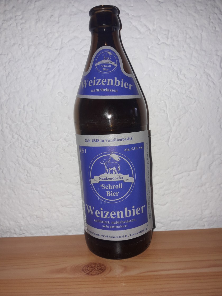 Im nächsten Biertest habe ich mal wieder ein Weizenbier aus Bayern, aber nicht aus Oberbayern, der klassischen Heimat der Weizenbiere sondern aus Oberfranken, aus Nankendorf von der Brauerei Schroll. Mit einem Alkoholgehalt von 5,5% bringt es auch ordentlich Volumen mit.