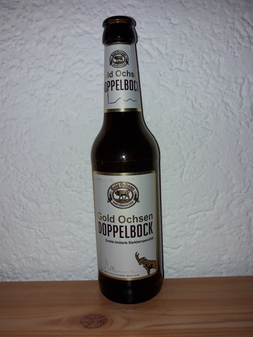 Von der Brauerei Gold Ochsen habe ich vor einiger Zeit wieder eine limitierte Starkbierspezialität im Laden entdeckt. Nachdem es zuvor schon einen Hellen Boc gab ist es dieses mal ein dunkler Doppelbock, der auch was das Etikett und die Flasche anbelangt seinem hellen Bruder recht ähnlich sieht. Der Alkoholgehalt liegt bei 7,2%.