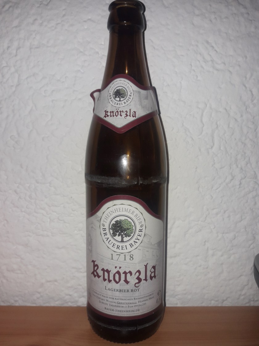 Die Brauerei befindet sich im Steigerwald, einem Teil Unterfrankens. Da Unterfranken eher eine Weinregion ist, hat die Brauerei auch zwei sehr interssante Weinböcke im Sortiment, bei denen Bockbier mit Wein verschnitten wurde. Neben sonst nach anderen sehr ausgefallen, aber auch hochpreisigen Bierkreationen hat die Brauerei auch zwei klassische fränkische Biere im Sortiment. Eines ist das Knörzla Lagerbier, das ich hier heute verkoste. De Alkoholgehalt liegt bei 4,9%.